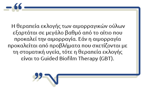 Η θεραπεία εκλογής των αιμορραγικών ούλων εξαρτάται σε μεγάλο βαθμό από το αίτιο που προκαλεί την αιμορραγία. Εάν η αιμορραγία προκαλείται από προβλήματα που σχετίζονται με τη στοματική υγεία, τότε η θεραπεία εκλογής είναι το Guided Biofilm Therapy (GBT). Η συγκεκριμένη θεραπεία αποτελείται από ένα υποσύνολο θεραπειών, οι οποίες συνδυάζονται χαρίζοντας το πιο αστραφτερό και πάνω απ’ όλα υγιές χαμόγελο.