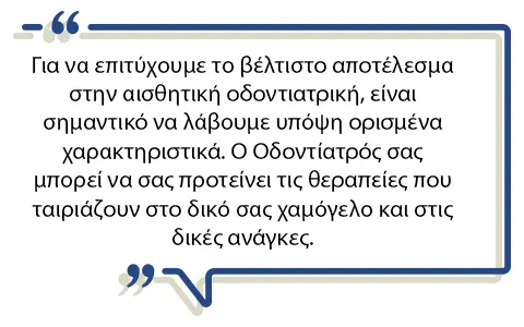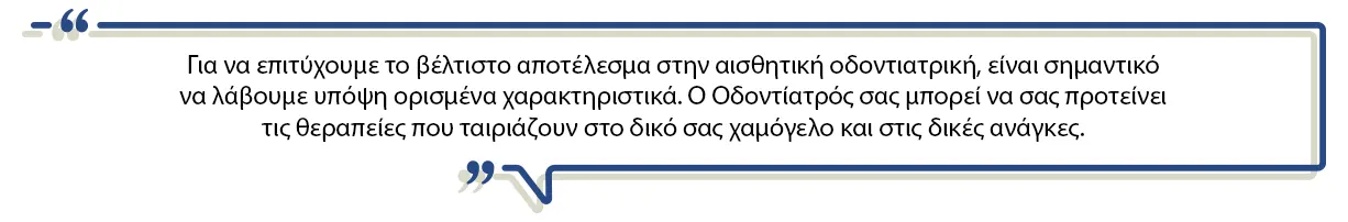 Για να επιτύχουμε το βέλτιστο αποτέλεσμα στην αισθητική οδοντιατρική, είναι σημαντικό να λάβουμε υπόψη ορισμένα χαρακτηριστικά. Το χρώμα των δοντιών πρέπει να είναι φωτεινό αλλά όχι ‘’ψεύτικο’’, καθώς πρέπει να αποφεύγονται οι υπερβολές που οδηγούν σε αφύσικο αποτέλεσμα. Οι αναλογίες μήκους-πλάτους των δοντιών θα πρέπει να είναι αρμονικές, ώστε να μη δημιουργούνται τετράγωνα ή στενόμακρα δόντια. Οι γωνίες των δοντιών θα πρέπει να είναι αποστρογγυλεμένες και όλα τα δόντια να έχουν την ημιδιαφάνεια που έχουν και τα φυσικά μας δόντια.