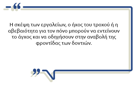 Επίσης, ο φόβος για τον πόνο και τις βελόνες είναι πολύ συχνός. Στη σύγχρονη οδοντιατρική, όμως, η αναισθησία εξασφαλίζει άνεση. Ο ήχος και η αίσθηση των εργαλείων μπορεί να εντείνουν το άγχος. Ο τροχός και τα μεταλλικά όργανα θυμίζουν παλιές εμπειρίες. Η αίσθηση απώλειας ελέγχου, επίσης, προκαλεί φόβο. Στην καρέκλα, ο ασθενής νιώθει αδύναμος να σταματήσει τη διαδικασία. Τέλος, οι ιστορίες άλλων ανθρώπων μπορούν να επηρεάσουν αρνητικά. Διηγήσεις για δύσκολες θεραπείες ενισχύουν τον φόβο, ακόμη και αν δεν ανταποκρίνονται στην πραγματικότητα.