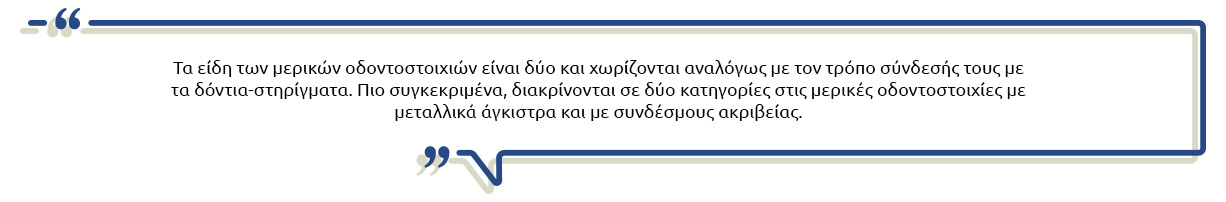 Οι μερικές οδοντοστοιχίες διακρίνονται σε δύο είδη, ανάλογα με τον τρόπο που εφάπτονται στα δόντια-στηρίγματα. Πιο συγκεκριμένα, έχουμε: