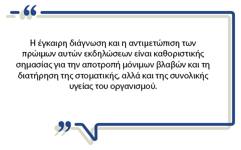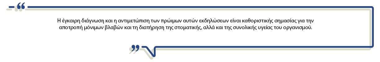 Συχνά, οι πρώτες αλλοιώσεις γίνονται αντιληπτές μόνο κατά τη διάρκεια τακτικού οδοντιατρικού ελέγχου. Η έγκαιρη διάγνωση και η αντιμετώπιση των πρώιμων αυτών εκδηλώσεων είναι καθοριστικής σημασίας για την αποτροπή μόνιμων βλαβών και τη διατήρηση της στοματικής, αλλά και της συνολικής υγείας του οργανισμού.