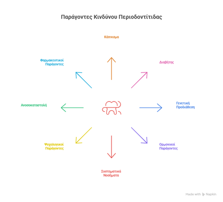 - Συστηματικά Νοσήματα: Καρδιαγγειακές, φλεγμονώδεις και ανοσοκατασταλτικές παθήσεις σχετίζονται με αυξημένο κίνδυνο περιοδοντικής νόσου.