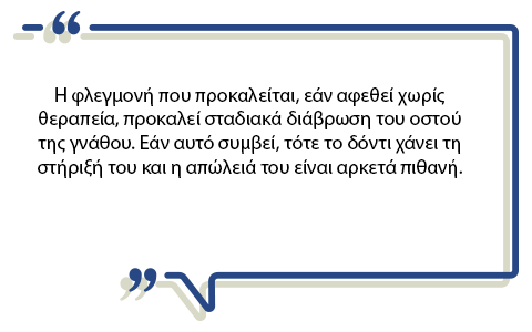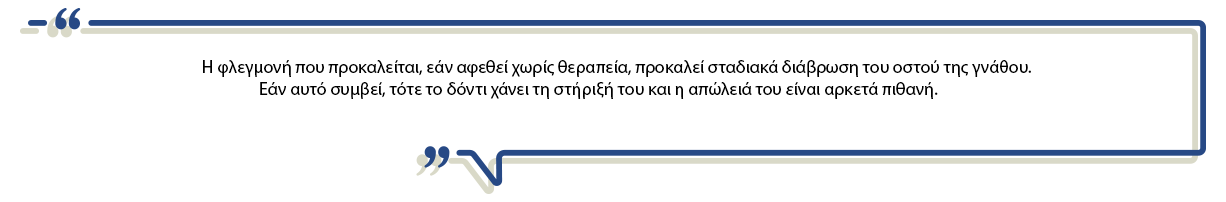 Η θεραπεία της περιστεφανίτιδας θα πρέπει να είναι άμεση μετά τη διάγνωσή της. Η φλεγμονή που προκαλείται, εάν αφεθεί χωρίς θεραπεία, προκαλεί σταδιακά διάβρωση του οστού της γνάθου. Εάν αυτό συμβεί, τότε το δόντι χάνει τη στήριξή του και η απώλειά του είναι αρκετά πιθανή.