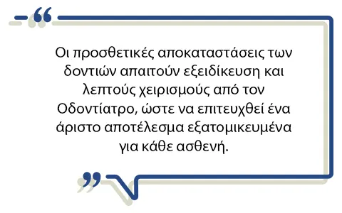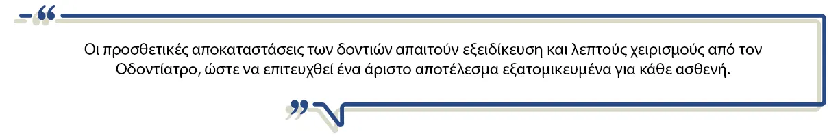 Η Οδοντική Προσθετική ή Προσθετολογία είναι η ειδικότητα που ασχολείται με τις προσθετικές αποκαταστάσεις. Οι προσθετικές αποκαταστάσεις είναι όλες εκείνες οι τεχνικές που μετά από την απώλεια ενός ή περισσότερων δοντιών αναπληρώνουν: