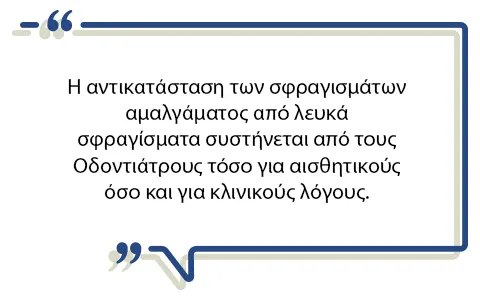 Οι υψηλές αισθητικές απαιτήσεις των ασθενών δεν περιορίζονται στην πρόσθια αισθητική ζώνη, αλλά οι περισσότεροι επιδιώκουν την άψογη εικόνα σε όλο το εύρος του χαμόγελου. Εκτός όμως από αισθητικής άποψης τα μαύρα σφραγίσματα αμαλγάματος έχουν μειωθεί αισθητά από το σύνολο των Οδοντιάτρων και για κλινικούς λόγους.
