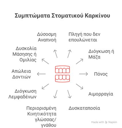 Τα συμπτώματα του στοματικού καρκίνου συνήθως καθυστερούν να γίνουν αντιληπτά στα αρχικά στάδια και γι’ αυτό η νόσος συχνά διαγιγνώσκεται σε προχωρημένο στάδιο.